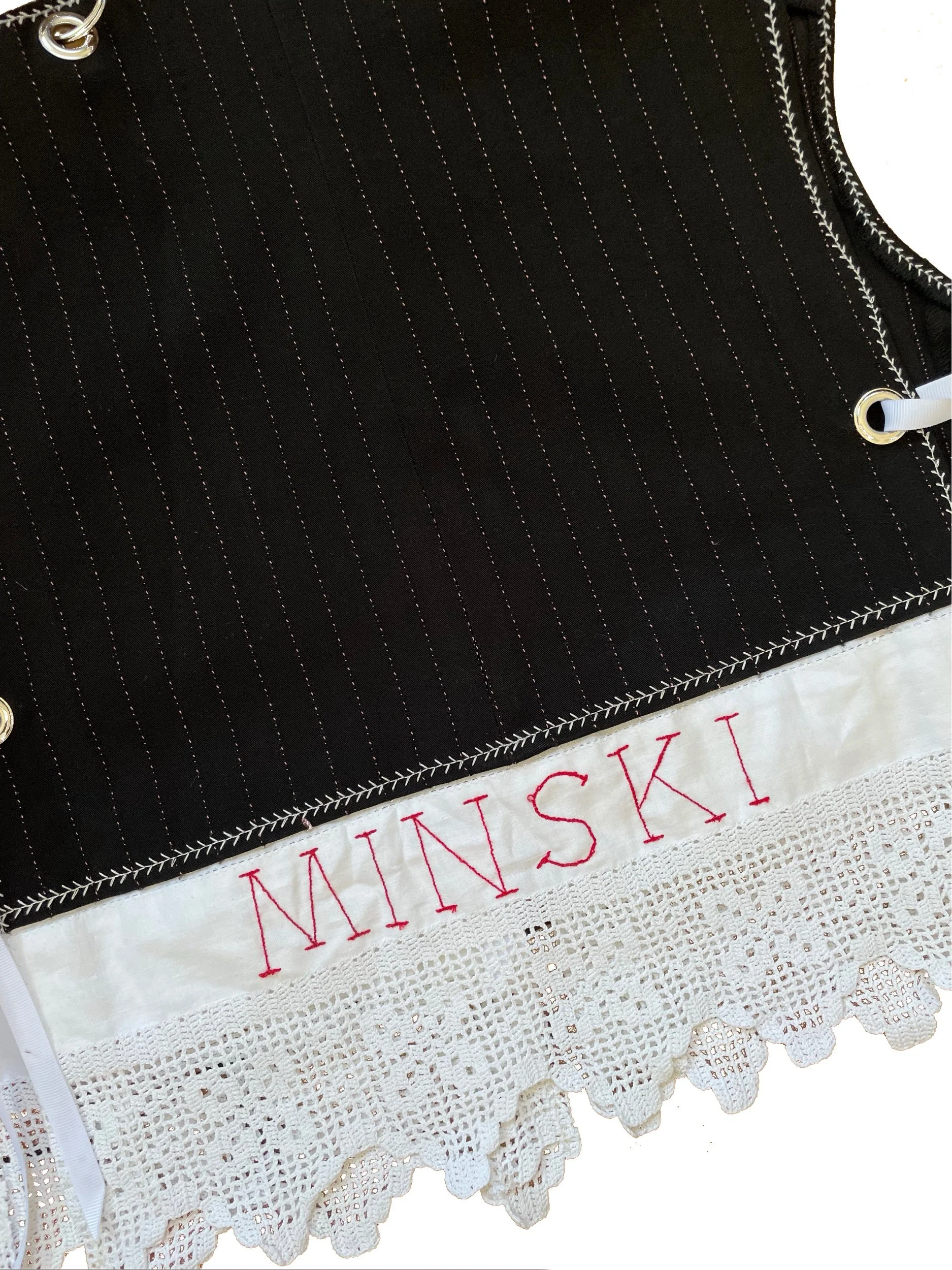 This unique co-ord is made from 100% upcycled materials. I’ve combined a pre-loved pinstripe suit with carefully chosen vintage tablecloth and crochet pieces.
